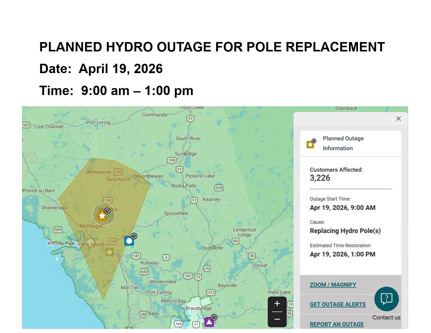PLANNED HYDRO ONE POWER OUTAGE FOR POLE REPLACEMENT: APRIL 19, 2026 9:00 AM TO 1:00 PM