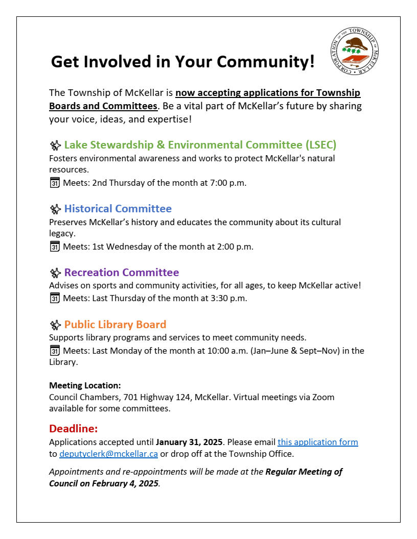 The Recreation Committee meets the last Thursday of each month at 3:30 p.m. in Council Chambers. The Township of McKellar Recreation Committee advises the Township of McKellar Council on activities and sports to be organized and provided for the community. To this end, the McKellar Recreation Committee welcomes any input or volunteers that can help McKellar continue to be an active and enjoyable community in which to live and play.